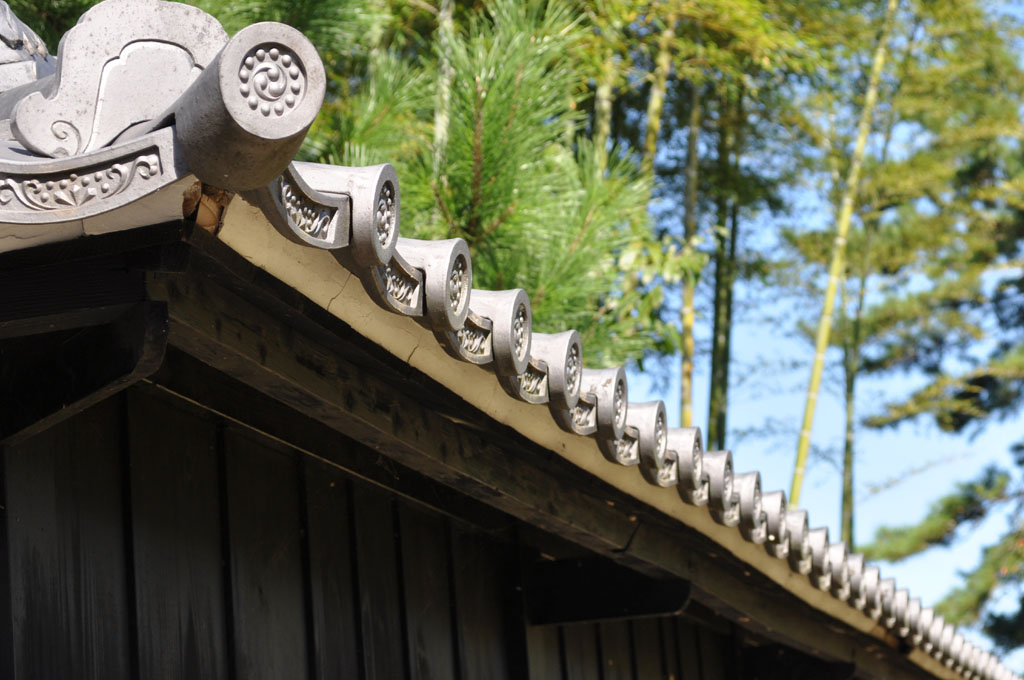 家紋が入った獅子口の軒先瓦と、黒板塀。